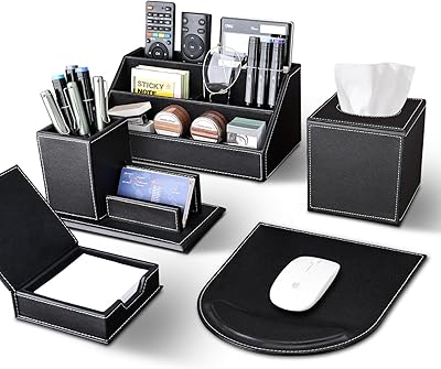KINGFOM 5PCS Desk Organizer and Accessories Set, Pu Leather Office Supplies with Multifunction Desktop Organizer Storage Box, Tissue Holder, Mouse Pad, Note Paper Holder, Pencil Holder for Desk Black